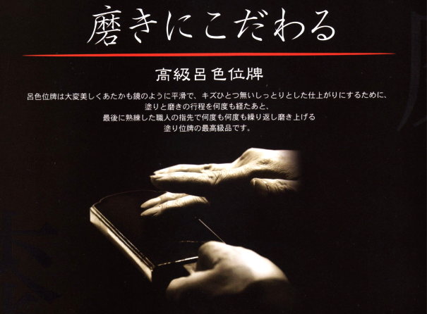 漆塗り後に微粒子で表面を更に均一に磨き上げ上質な光沢のある位牌。
